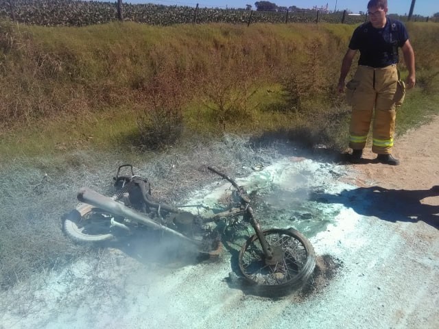 Por causas que se tratan de establecer la moto tomó fuego, mientras circulaba por el camino que va hacia la mencionada localidad, y en pocos minutos quedó consumida por las llamas. Afortunadamente su conductor no sufrió heridas.