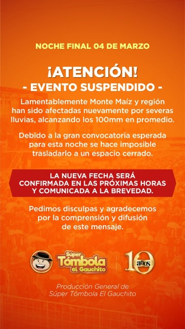 Debido a la gran caída de lluvia en Monte Maíz y en la región se suspendió el sorteo de la Súper Tómbola El Gauchito previsto para este lunes desde las 17:00 hs.