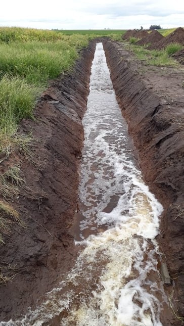 En lo que respecta al canal de Campo Santiano ya se construyó 4,5 kms. de un total de 17 kms. de longitud. En la tarde del martes ya comenzó a drenar la primer laguna a la cual se conecta dicho canal de desagüe. Así lo informó a este Medio el Presidente del Consorcio, Ing. Jorge Cervigni.