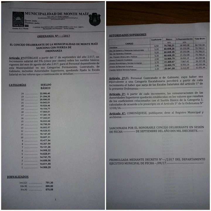 En sesión Ordinaria del Honorable Concejo Deliberante del día 19 de setiembre quedó aprobado con fuerza de Ordenanza un aumento salarial del 5% para todos los empleados Municipales. El mismo rige a partir del 1° de setiembre del corriente año para las Categorías Permanentes, Contratados, de Gobierno, incluidas Autoridades Superiores. De esta manera, la escala quedó constituida de la siguiente manera: