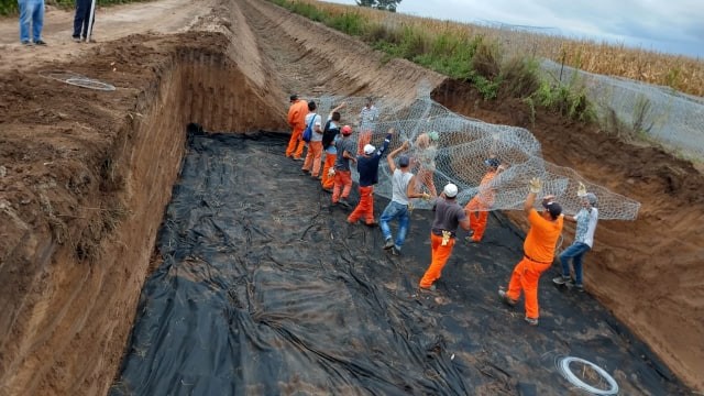 Sobre el tema el Ing. Jorge Cervigni, Presidente del Consorcio Canalero explicó que se van a hacer tres de estos saltos: “Este es un canal que no es muy profundo y se comenzó desde un camino que va a Monte Buey de Este a Oeste y hacia el Sur. Se debió construir ahí una especie de By Pass donde quedó el espacio para los saltos. Por ellos el agua cae como si fuera una pequeña cascada para tomar otro nivel. Hay que hacer tres de estos saltos. Son muy caros porque se construyen con gaviones. Estos son como un fardo hecho todo de alambre y con piedras adentro. Esto hay que afirmarlo y unirlo con hormigón de tal manera que el escurrimiento del agua no lo rompa y ese salto se mantenga con el tiempo. Los materiales están todos. Eso lleva una maya geotextil que es la que permite el paso del agua pero no de la tierra para que no se rompa. Cada salto lleva dos bateas de piedras y mucha mano de obra para armarlos. Luego con una Retroexcavadora se van colocando como si fueran ladrillos y se hormigonea”, detalló.