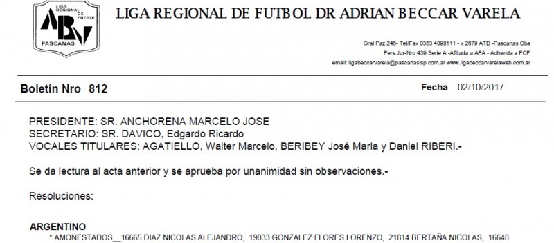 PRESIDENTE: SR. ANCHORENA MARCELO JOSE SECRETARIO: SR. DAVICO, Edgardo Ricardo VOCALES TITULARES: AGATIELLO, Walter Marcelo, BERIBEY José Maria y Daniel RIBERI.- Se da lectura al acta anterior y se aprueba por unanimidad sin observaciones.- Resoluciones: ARGENTINO * AMONESTADOS__16665 DIAZ NICOLAS ALEJANDRO, 19033 GONZALEZ FLORES LORENZO, 21814 BERTAÑA NICOLAS, 16648 SANTA COLOMA MATEO, 20709 LEMUS BRAIAN, 21561 CARRIZO SEBASTIAN DARIO, * SUSPENDIDOS__ 21561 CARRIZO SEBASTIAN DARIO 1 Partido Art.208,32,33 y 40, * EXPULSADOS __ 15220 IANNOTTI GABRIEL GUSTAVO 1 Partido Art.S/ Art. 210, 186, 32, 33 y 40.-, 14641 BELLONI JUAN ANDRES 1 Partido Art.S/ Art. 210, 186, 32, 33 y 40.-, 19859 GIORGI LUCAS MARTIN 1 Partido Art.S/ Art. 210, 186, 32, 33 y 40.-, 12374 VOTTERO GUILLERMO 2 Partidos Art.S/ Art. 201 inc. "b,4", 32, 33y 40.-, 16281 RASSOL JUAN IGNACIO 3 Partidos Art.S/ Art. 200 inc. "a,1", 32, 33 y 40.-, LAMBERT * AMONESTADOS__12819 REINA EZEQUIEL CLAUDIO, 17024 MERZARIO-BAMONDE MANUEL, * EXPULSADOS __ 19361 TORREZ DANILO 1 Partido Art.S/ Art. 207, 32, 33 y 40.-, RENNY * AMONESTADOS__19444 OLGUIN FRANCISCO JAVIER, 16538 ALEMANO MARTIN, 13292 BONAPACCE MARIANO ANDRES, 16499 FIGUEROA CARLOS LEONEL, 1019 BRUVA JULIO C., 17411 ORONEL ALEXIS, 19066 GRANDI EDUARDO E., * SUSPENDIDOS__ 17411 ORONEL ALEXIS 1 Partido Art.208,32,33 y 40, 19066 GRANDI EDUARDO E. 1 Partido Art.208,32,33 y 40, * EXPULSADOS __ 18947 IGARZABAL MAICO RAFAEL 1 Partido Art.S/ Art. 207, 32, 33 y 40.-, OLIMPO * AMONESTADOS__16854 ROMERO JONATAN FABIAN, 16851 VERGARA ERIC LEANDRO, 17907 CAUDANA AGUSTIN, 20566 BAGGINI AGUSTIN, * SUSPENDIDOS__ 17907 CAUDANA AGUSTIN 1 Partido Art.208,32,33 y 40, 20566 BAGGINI AGUSTIN 1 Partido Art.208,32,33 y 40, ATLETICO * AMONESTADOS__1281 SAPPEI CESAR DOMINGO, 16531 PRADO SERGIO FACUNDO, 20893 VILARCHIK CRISTIAN LEONEL, INDEPENDIENTE * AMONESTADOS__17639 GRANDI FERMIN AUGUSTO, 15930 TULA JUAN PABLO, 15254 SALERA LUCAS, 21884 DELGADO MAXIMILIANO, 14672 CERUTTI JUAN CARLOS, 15143 VILLAFAÑE JUAN CRUZ, 16490 BESSO EMANUEL DAVID, * SUSPENDIDOS__ 16490 BESSO EMANUEL DAVID 1 Partido Art.208,32,33 y 40, * EXPULSADOS __ 13592 TORDI FACUNDO DANIEL 3 Partidos Art.S/ Art. 200 inc. "a,8", 32, 33 y 40.-, SP. CHAZON * AMONESTADOS__19299 TEJEDA JOEL, 20308 MANSILLA JOSE AGUSTIN, 17820 CONTRERAS RODRIGO RAMON, 20446 ANDRES JUAN PABLO, 13075 SERRANO FRANCO ALBERTO, 17443 OVIEDO HERNAN HUGO, 20929 OVIEDO JONATHAN NICOLAS, * SUSPENDIDOS__ 20929 OVIEDO JONATHAN NICOLAS 1 Partido Art.208,32,33 y 40, ATENAS * AMONESTADOS__21650 QUIROGA CESAR ARIEL, 19246 TAVERNA SEBASTIAN NORBERTO, 19744 FERRERO MATIAS ALEJANDRO, 16278 PEYRANO FRANCISCO LIMBERT, 17770 SAN-MARTIN JULIAN, 21888 PICCO EMILIANO, * SUSPENDIDOS__ 17770 SAN-MARTIN JULIAN 1 Partido Art.208,32,33 y 40, 21888 PICCO EMILIANO 1 Partido Art.208,32,33 y 40, NEWBERY * AMONESTADOS__20894 ZALAZAR ALEXIS ABEL, 15157 GODI IMANOL, 18953 TORRES ELIAS, 19372 OLMEDO MAXIMILIANO JESUS, 17341 ORTIZ MATIAS DANIEL, * SUSPENDIDOS__ 19372 OLMEDO MAXIMILIANO JESUS 1 Partido Art.208,32,33 y 40, 17341 ORTIZ MATIAS DANIEL 1 Partido Art.208,32,33 y 40, * EXPULSADOS __ 15159 BUSTO-SEIN NICOLAS MARCELO 1 Partido Art.S/Art. 207, 32, 33 y 40.-, 17348 PRATTO FRANCISCO ADOLFO 3 Partidos Art.S/ Art. 200 inc. "a,8", 32, 33 y 40.-, SP.RURAL * AMONESTADOS__16252 LARESE DANIEL NICOLAS, SARMIENTO(E) * AMONESTADOS__18971 VILLEGAS SANTIAGO AGUSTIN, 17296 GODOY ALEJANDRO GASPAR, 20315 GAUNA RODOLFO ORLANDO, 17289 SUAREZ ENZO, 16086 BARBIANI FERNANDO MARIO, * SUSPENDIDOS__ 16086 BARBIANI FERNANDO MARIO 1 Partido Art.208,32,33 y 40, SARMIENTO(I) * AMONESTADOS__20703 OLMOS LUCERO GONZALO, 13354 MARIANI CLAUDIO JONATHAN, 15401 CALDERON JOSE LUCAS, 14153 MARTINATTO GONZALO NICOLAS, 19856 TORANZA FACUNDO N., 14154 PERALTA GASPAR, 13347 FENOGLIO ROMAN DAVID, * SUSPENDIDOS__ 14154 PERALTA GASPAR 1 Partido Art.208,32,33 y 40, 13347 FENOGLIO ROMAN DAVID 1 Partido Art.208,32,33 y 40, Se sanciona al Sr. FASANO Luis DNI: 22.797.060 Director Técnico Fútbol Mayor del Club D. Argentino, según el informe arbitral del Sr. CEBALLOS César, del partido disputado el día 01 de Octubre del cte., entre los pares del Independiente Foot Ball Club Vs. Club D. Argentino en Primera División, con 2 (dos) partidos de suspensión S/Art. 186, 260, 32, 33 y 40.- Se sanciona al Sr. BONET Alexis DNI: 38.728.330 Ayudante de Campo Fútbol Mayor del Club D. Argentino, según el informe arbitral del Sr. CEBALLOS César, del partido disputado el día 01 de Octubre del cte., entre los pares del Independiente Foot Ball Club Vs. Club D. Argentino en Primera División, con 2 (dos) partidos de suspensión S/Art. 186, 260, 32, 33 y 40.- Se suspende provisoriamente y se cita a declarar para el día jueves 05 de Octubre del cte. en la sede de la Liga a las 22:15hs, al Sr. GIAIME Ezequiel Carnet N 2118 del Club D. Argentino, para que emita descargo y esgrima su derecho a defensa del informe arbitral del Sr. CEBALLOS César, del partido disputado el día 01 de Octubre del cte., entre los pares del Independiente Foot Ball Club Vs. Club D. Argentino en Primera División.- Se cita para el día jueves 05 de Octubre del cte. en la sede de la Liga a las 21:00hs, al Sr. CEBALLOS César, para que ratifique, rectifique y/o amplíe su informe arbitral del partido disputado el día 01 de Octubre del cte., entre los pares del Independiente Foot Ball Club Vs. Club D. Argentino en Primera División.- Se cita para el día jueves 05 de Octubre del cte. en la sede de la Liga a las 21:15hs, al Sr. LUJAN Gabriel, para que ratifique, rectifique y/o amplíe su informe arbitral del partido disputado el día 01 de Octubre del cte., entre los pares de Club G. Renny Vs. Club Atlético y B. Pascanas en Primera División.- Se suspende provisoriamente y se cita a declarar para el día jueves 05 de Octubre del cte. en la sede de la Liga a las 22:30hs, a los Sres. BELLINO Leonardo Carnet N 13284 y Sr. BELLINO Darío Nicolás DNI: 32.429.619, ambos del del Club Guillermo R