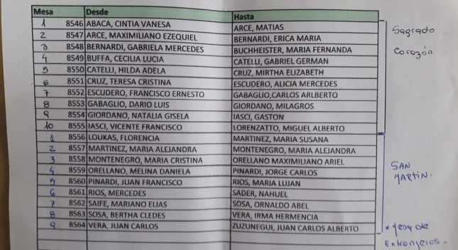 Según los datos informados votarán en la escuela Fray Mamerto Esquiú desde la letra “A” hasta “Lorenzatto, MiguelAlberto”. Mientras que desde Martínez, María Susana hasta la letra “Z” votarán en la escuela José de San Martín. Además, en este colegio, en la última Mesa -La N°9- estará anexado el Padrón de extranjeros.,