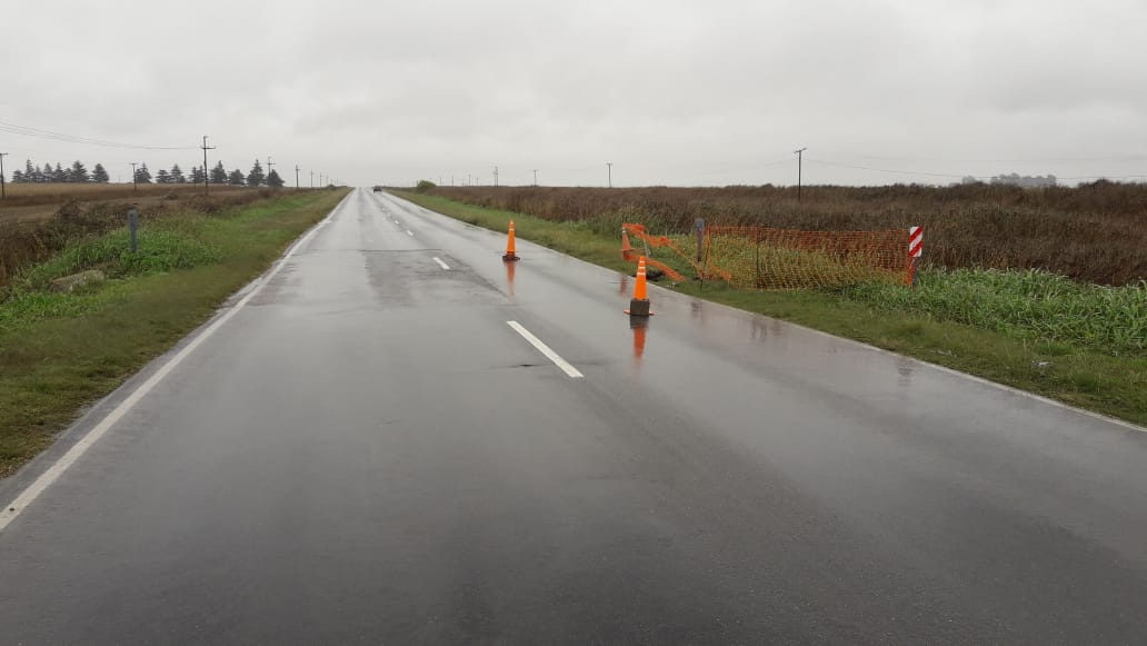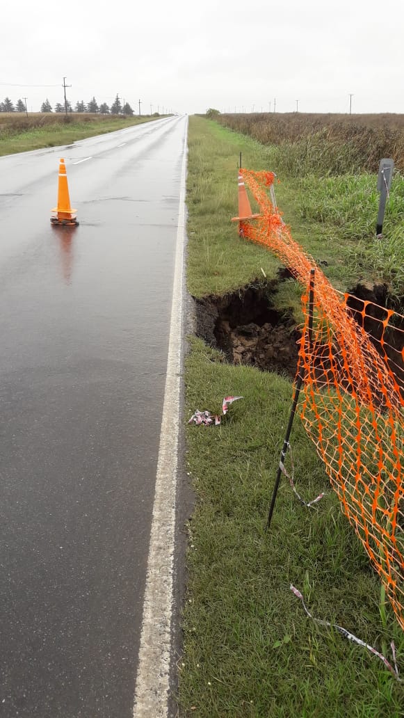 Personal de la Policía de Monte Maíz se encuentra en ruta Provincial N°11 señalizando la rotura de una alcantarilla en la mano Norte (sentido Monte Maíz hacia Wenceslao Escalante), la misma colapsó hace unos dos meses como consecuencias de abundantes lluvias y nunca fue arreglada por la Dirección Provincial de Vialidad.