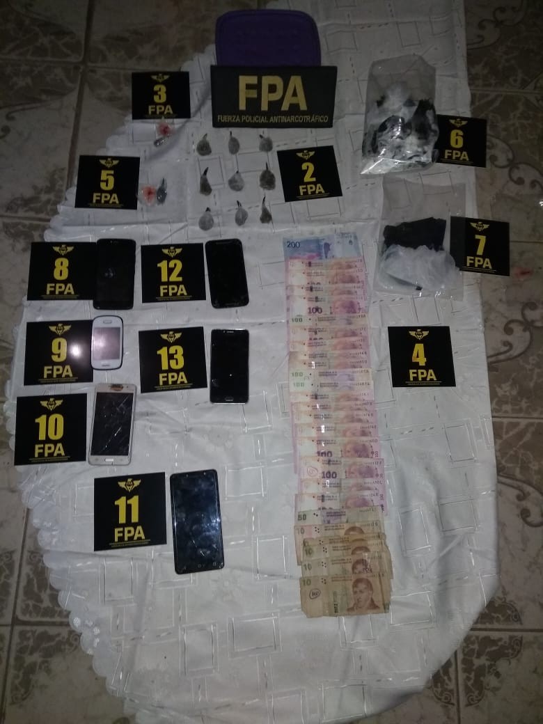 Al ingresar a la vivienda, personal de la Fuerza requisó a una detenida y en el bolsillo de su campera tenía varios envoltorios de marihuana listos para la venta. A continuación se incautó dinero y elementos aparentemente ligados al fraccionamiento de sustancias ilícitas. Además, el can Byron halló dosis de cannabis sativa en una cama matrimonial.