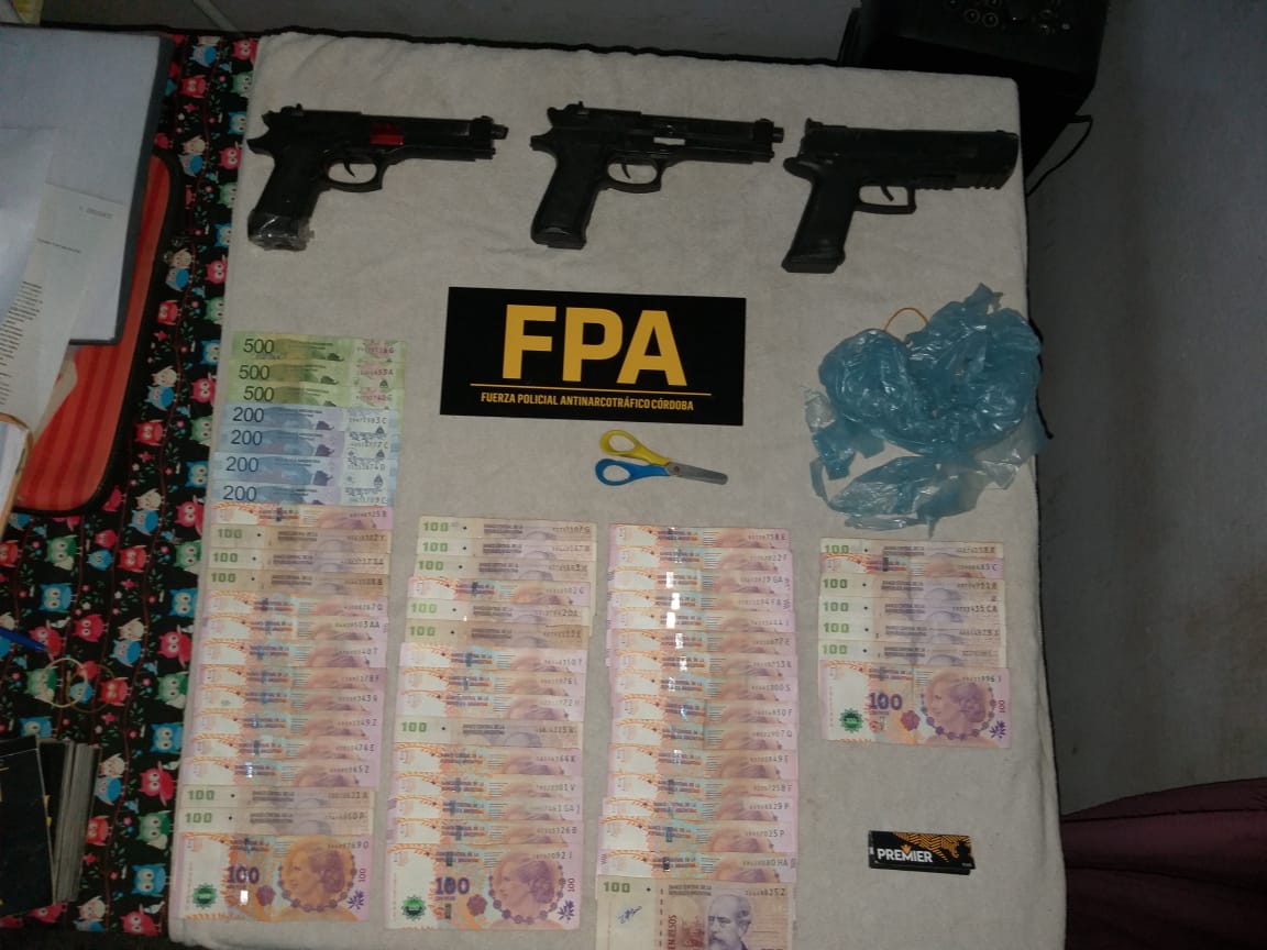En los lugares se secuestraron tres ladrillos de marihuana, conteniendo un total de 2,4 kilos, 302 dosis de cocaína, 111.270 pesos, dos vehículos (marca Renault y Chevrolet,) y tres réplicas de armas de fuego, entre otros elementos presuntamente relacionados al narcomenudeo.