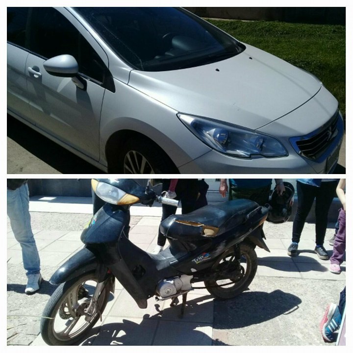 En horas del mediodía del domingo aproximadamente a las 12:30 hs. se produjo un accidente de tránsito en el cual un Peugeot 408 de color blanco, Dominio PKO 252, conducido por Vanesa Corones domiciliada en calle Jujuy 1749 de Monte Maíz, que se conducía por calle Salta de Norte a Sur; por causas que se tratan de establecer rozó una moto Guerrero Trip 110 c.c. de color negro, Dominio BTC 178, conducida por Angelina Esther Steinacher de 36 años de edad, domiciliada en calle San Luis 1323 de nuestra localidad. Como acompañantes viajaban Nicolle Buffa de 13 años de edad y Renata Pedraza de 2 años de edad; la primera domiciliada en calle San Juan 2403, mientras la beba es de Laborde domiciliada en calle Dr. Da Vinci s/n de esa localidad. A raíz de la mala maniobra quienes se conducían en el rodado menor cayeron al piso y debieron ser trasladadas al Hospital Dr. José María Minella, permaneciendo en observación por escoriaciones en pierna izquierda a la altura del tobillo la conductora, Angelina Steinacher. Mientras que las dos acompañantes fueron dadas de alta inmediatamente ya que no presentaban lesiones. Fueron atendidas por el Médico de Guardia, Dr. Antonio Genta. La conductora del Peugeot no presentaba lesiones. Ambos vehículos fueron secuestrados preventivamente y alojados en sede Policial.