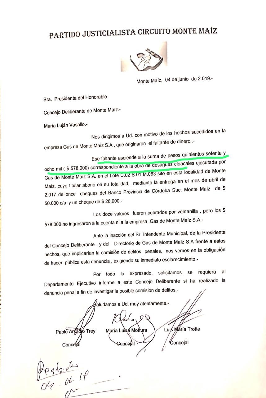 El Bloque de Concejales de la Oposición (PJ), conformado por Luis María Trotte, María Luisa Mottura y Pablo Trey, presentó una Nota en la que denuncian el faltante de dinero en la empresa Gas de Monte Maíz S.A. La misiva fue entregada a la Presidenta del Cuerpo Legislativo local, María Luján Vasallo, en la Sesión Ordinaria de anoche.