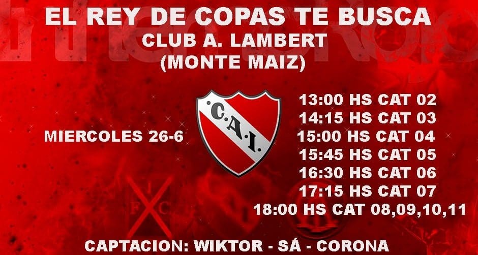 A esta captación de jugadores que realizará el Rey de Copas están invitados los Clubes de nuestra Zona; así lo indicó el Rojo de Monte Maíz en la Cuenta de Facebook de sus Inferiores.