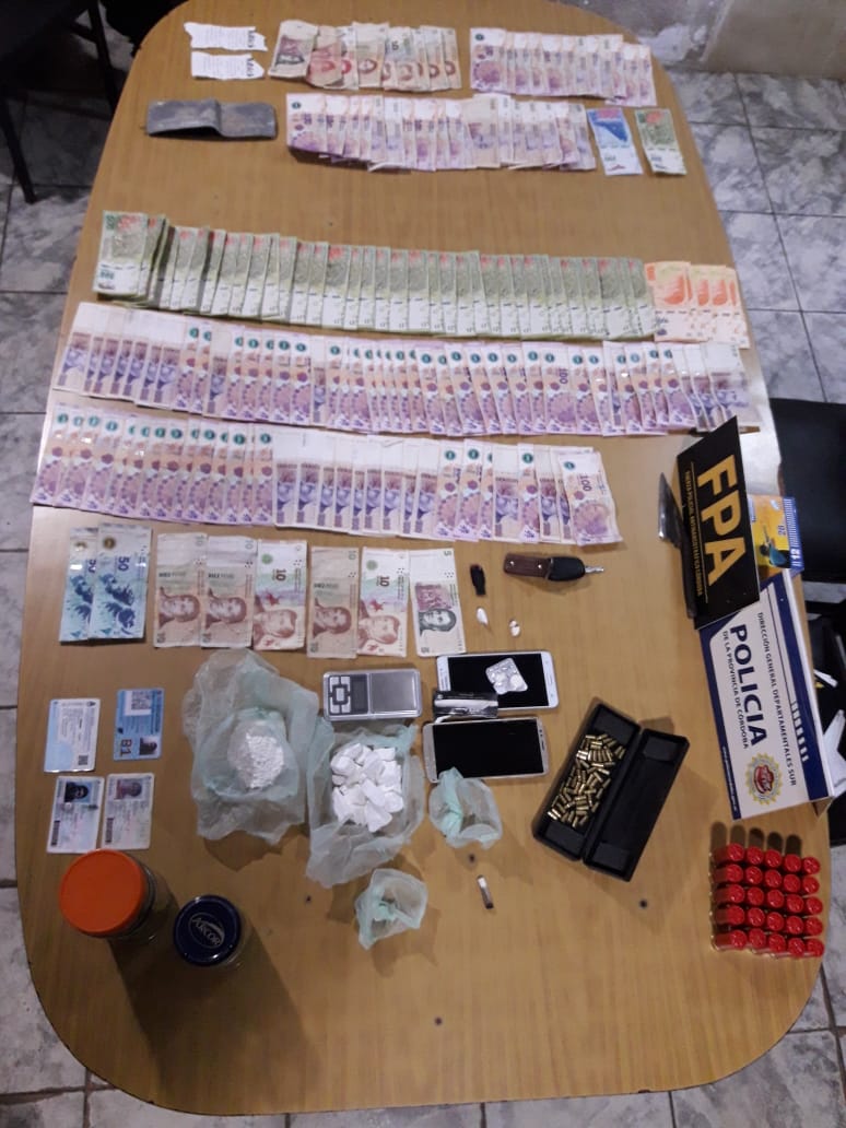 En la oportunidad, personal policial controló a dos sujetos de 20 y 25 años de edad (Santiago Ezequiel Corvalán y Matías Ricardo Zárate), secuestrándoles 62 gramos de marihuana y 141,85 gramos de cocaína, además de 81 cartuchos de armas de fuego y 29.445 pesos. Tras el hallazgo fueron detenidos por supuesta infracción a la Ley Nacional de Estupefacientes.