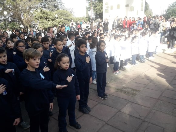Luego el Padre Martín Simonassi elevó una Plegaria en homenaje a la fecha y dio la Bendición. Acto seguido, y con la guía de la Inspectora de Zona 3320, Laborde, Profesora Mirian Maggi los alumnos de las tres escuelas primarias –de Cuarto Grado- de nuestra localidad Prometieron Lealtad a nuestra Bandera.