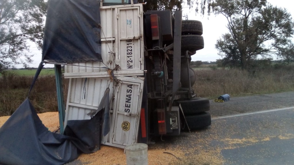 Un camión Iveco Cursor 330 Dominio OOZ 618 con acoplado, cargado con maíz y conducido por un masculino oriundo de Villa Dolores, quien circulaba de oeste a este, perdió el control de la unidad y volcó sobre la ruta.