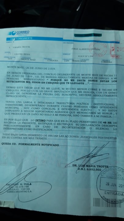 El Intendente electo en elecciones Municipales del 14 de abril del corriente año, Dr. Luis María Trotte, y actual Concejal de Monte Maíz para la Victoria (PJ) intimó a su par, el Edil de la UCR, Ing. Jorge Cervigni, a ratificar o rectificar en un plazo de 48 hs. los dichos vertidos en Sesión Ordinaria del día martes 11 de junio pasado.