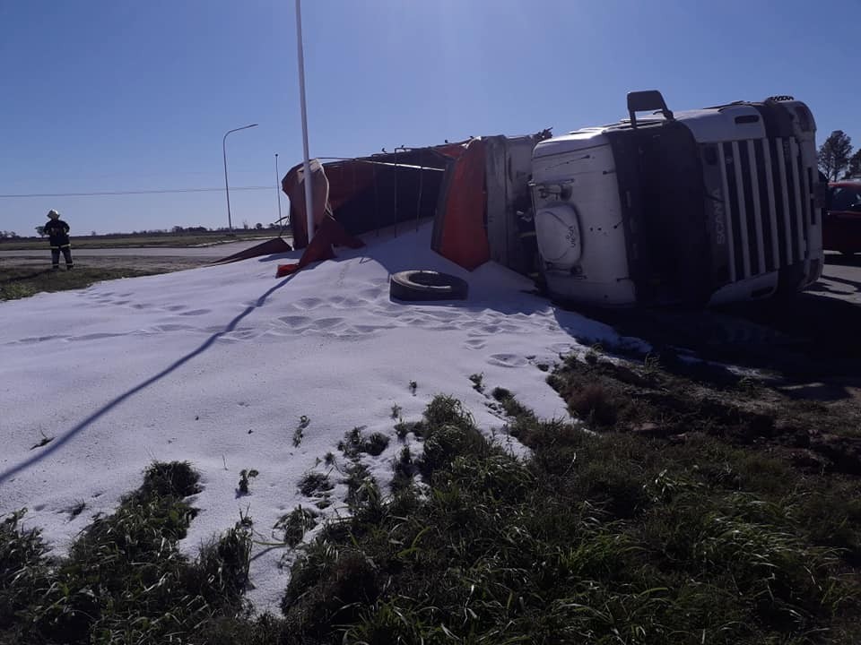 Cerca de las 12:30 hs. de ayer fueron alertados los Bomberos de Corral de Bustos por el vuelco de un camión en la rotonda de O´Higgins. Se trata de un camión marca Scania 320 con batea que transportaba 28 toneladas de urea granulada y que era conducido por Maximiliano Gamleri oriundo de La Carlota y propietario del vehículo de gran porte.