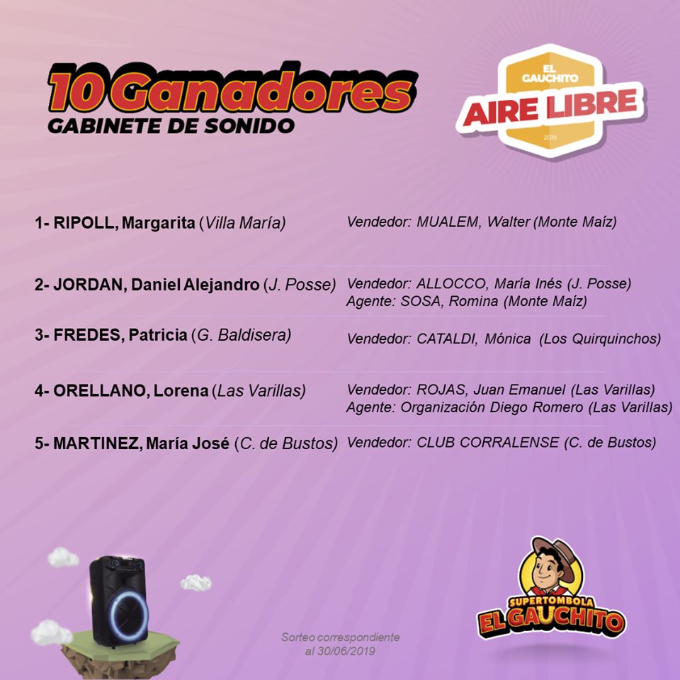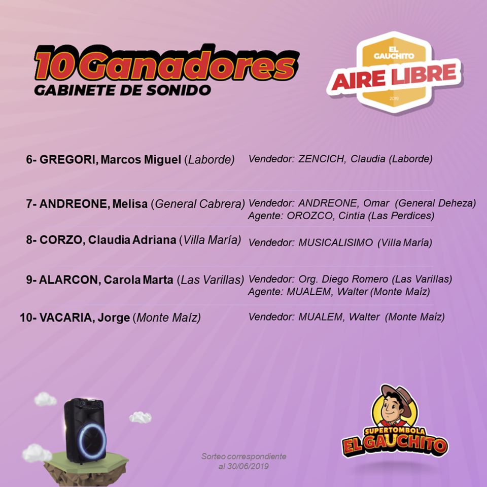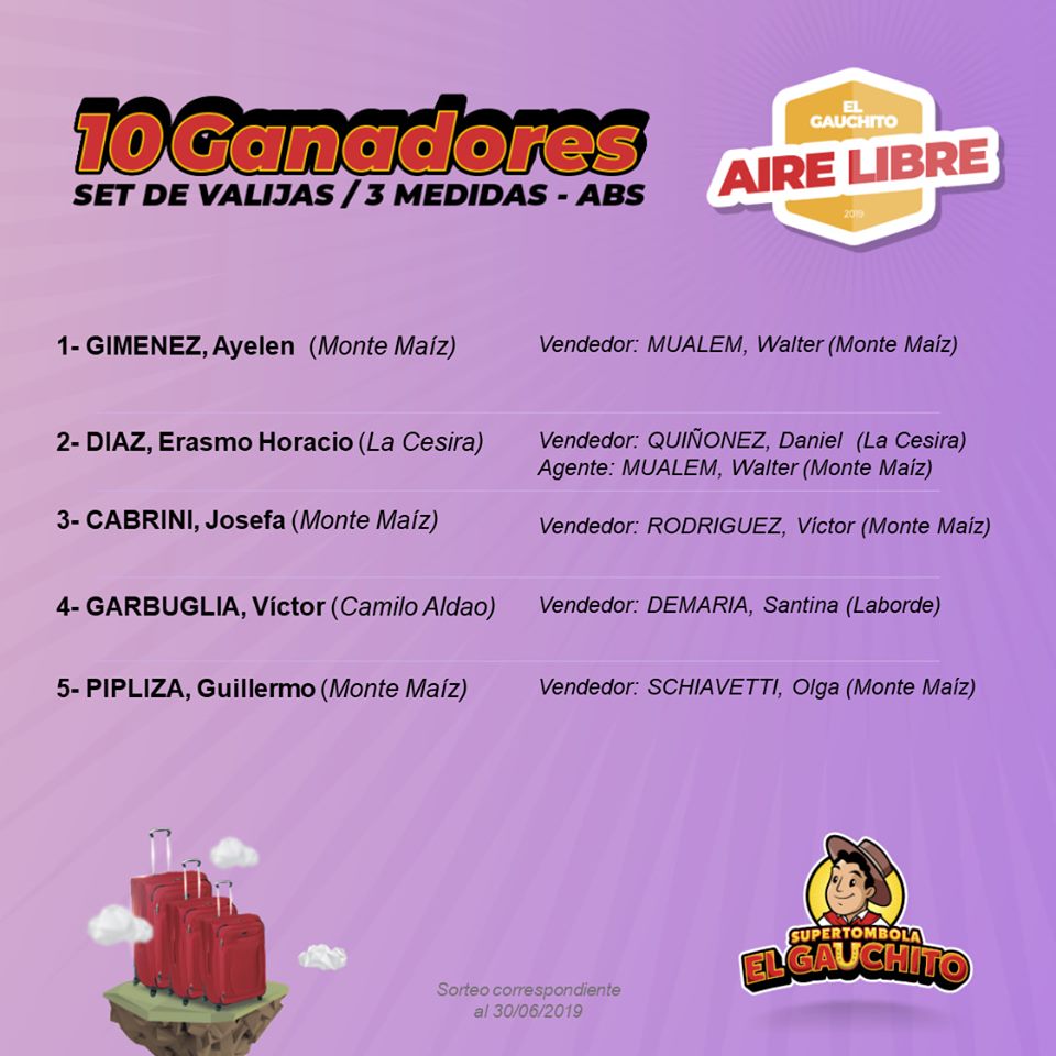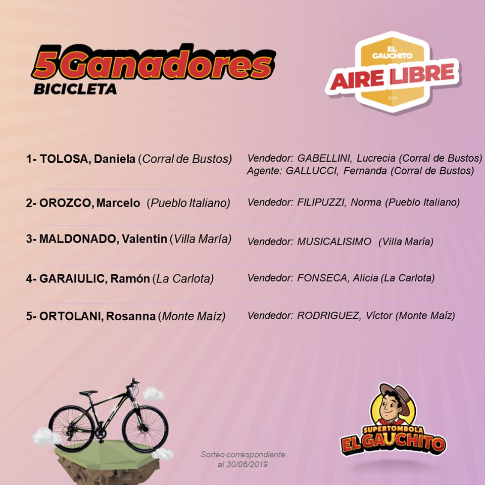 En este Sorteo Aire Libre el Gauchito entregó 5 bicicletas; 10 Sets de Valijas y 10 Parlantes. Conocé el listado de los Felices Ganadores.