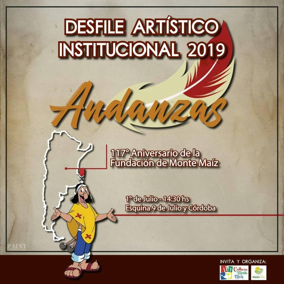 En el marco del 117° Aniversario de la fundación de Monte Maíz se llevará a cabo en horas de la tarde, 14:30 hs., la 4° Edición del Desfile Artístico Institucional en calle 9 de julio, frente a la plaza José de San Martín.