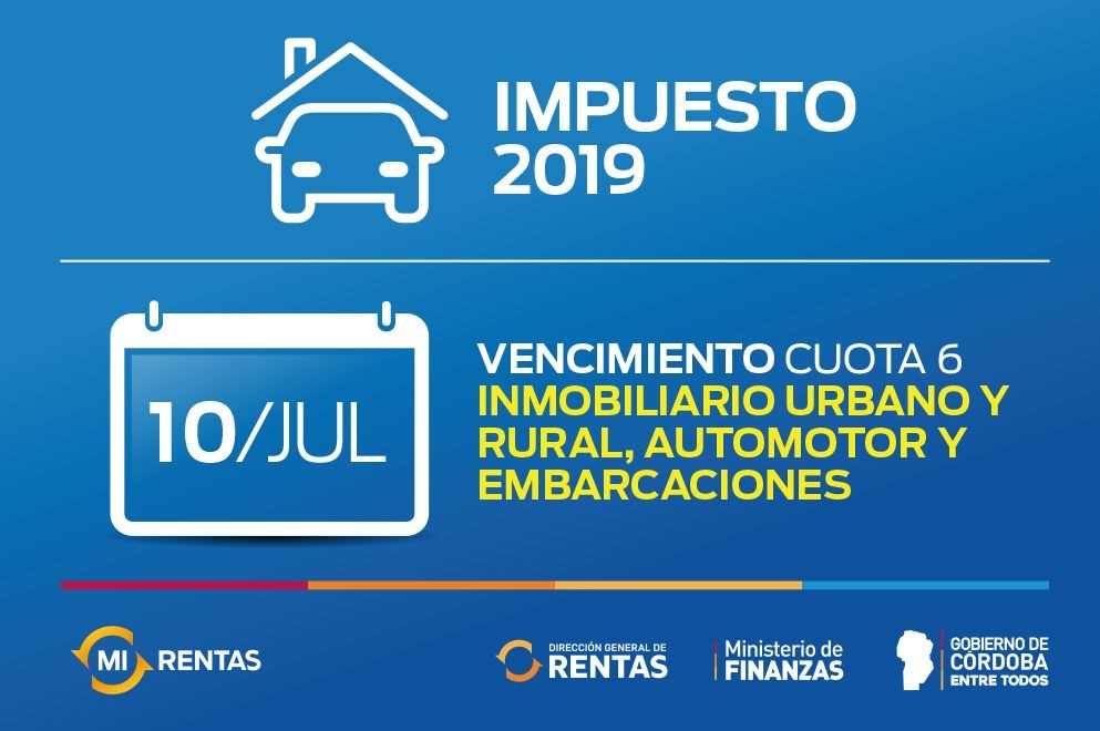 La Dirección General de Rentas recuerda que hay tiempo hasta el próximo miércoles 10 de julio para el pago de la cuota 6 de los Impuestos Inmobiliario Urbano y Rural, Automotor y a las Embarcaciones. Este vencimiento está dirigido a los ciudadanos que optaron por el pago en cuotas mensuales de sus impuestos 2019.