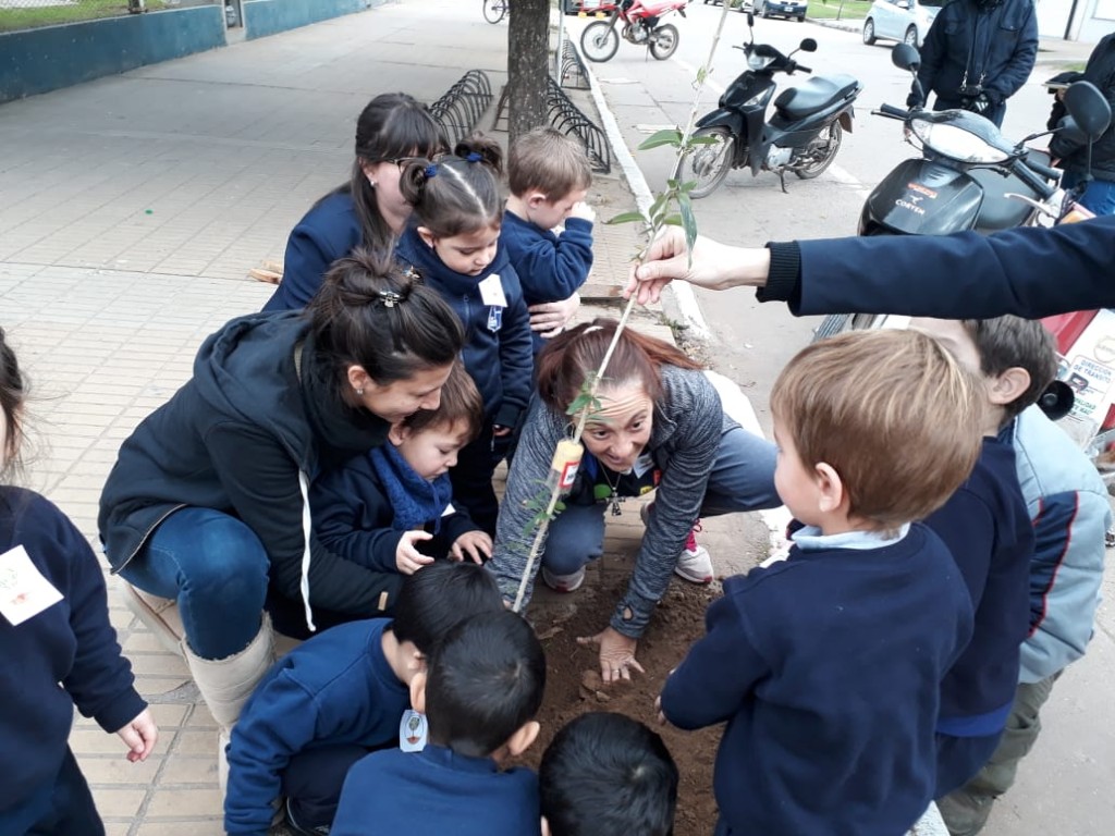 En la visita a los alumnos de las tres Salitas del Jardín de Infantes Fray Mamerto Esquiú se les explicó a los niños, a través de talleres, la importancia de la forestación. Así fue como se plantaron árboles en la vereda de la Institución. Allí se vivió una situación muy emotiva ya que notaron como los chicos se involucraron en dejar su huella verde.