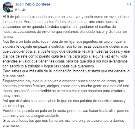 “El 9 de julio tenía planeado pasarlo en salta, ver y sentir como se vive ahí esa fecha patria. Pero todo se esfumó el día 5 apenas arrancamos nuestra vacaciones en mi querida Córdoba capital, ahí quedaron el sueños de nuestras vacaciones de invierno que veníamos planeado hacer y disfrutar en familia.