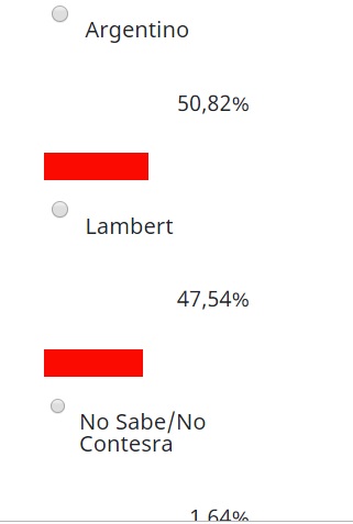 El 50.82% de quienes participaron de la encuesta votó a Argentino; el 47,64% votó en favor de Lambert y el 1,64 votó por el No Sabe, No contesta. De todas maneras el Campeonato se define dentro de un rato y allí tendremos el resultado final del Torneo.