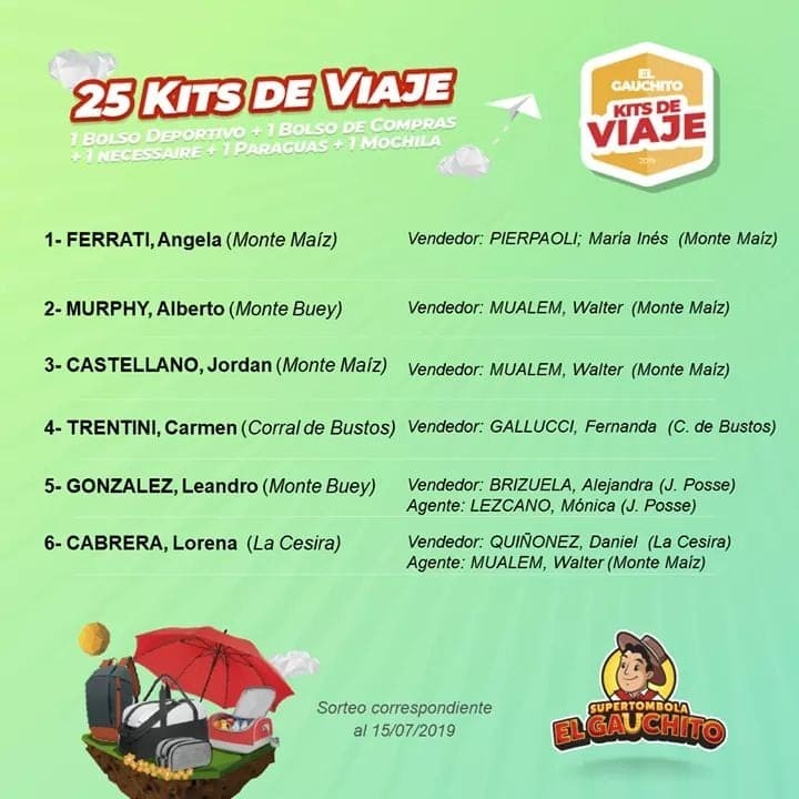 El Gauchito realizó un nuevo sorteo mensual en el que regaló 25 kits de viajes. Bolsos, paraguas, cooler y más. Conocé el listado de Ganadores: