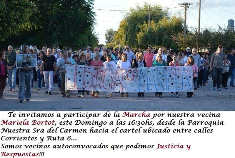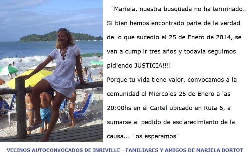 En días, el próximo 25 de Julio comenzará el Juicio para terminar de comprender qué paso con Mariela Bortot, de (40) cuarenta años al momento de su desaparición, aquella tardecita de Enero de 2014, en la "tranquila" localidad de Inriville, momento aquel en el que la víctima emprendió ante la mirada de muchos vecinos del lugar, una caminata que era algo habitué para su estilo de vida, en aquel momento con un brazo inmovilizado, con el celular en la otra mano y en ojotas color fucsia se la vio por última vez. Nadie podría imaginarse que en horas más tarde comenzaría el dolor de su ausencia, el miedo y tantos interrogantes sin respuestas. Una sociedad en vilo, reclamando por una hija de su tierra, ante la mirada tantas veces aletargada de la Justicia.