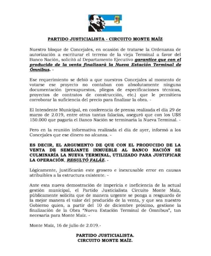 Ante esta nueva demostración de impericia e ineficiencia de la actual gestión municipal, el Partido Justicialista Circuito Monte Maíz, públicamente solicita que de manera urgente se ponga a resguardo de la mejor manera el valor del producido de la venta, y que sea nuestro Gobierno quien, a partir del 10 de diciembre próximo, gestione la finalización de la Obra “Nueva Estación Terminal de Ómnibus”, tan necesaria para Monte Maíz. -