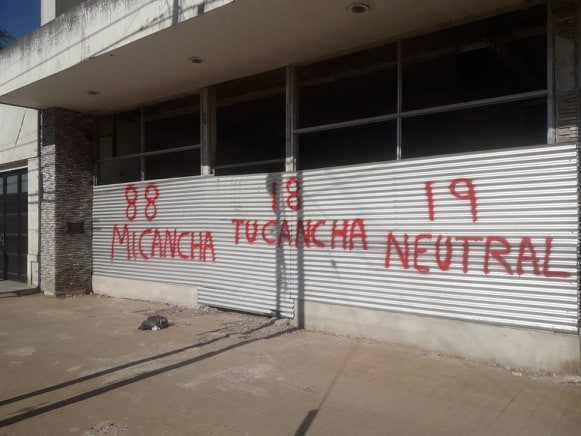 En la mañana del martes se pudieron ver pintadas en la “Caja de Cristal”, uno de los edificios más tradicionales del centro de nuestra localidad que desde hace algunos años pertenece a la Mutual de Asociados del Club Deportivo Argentino.
