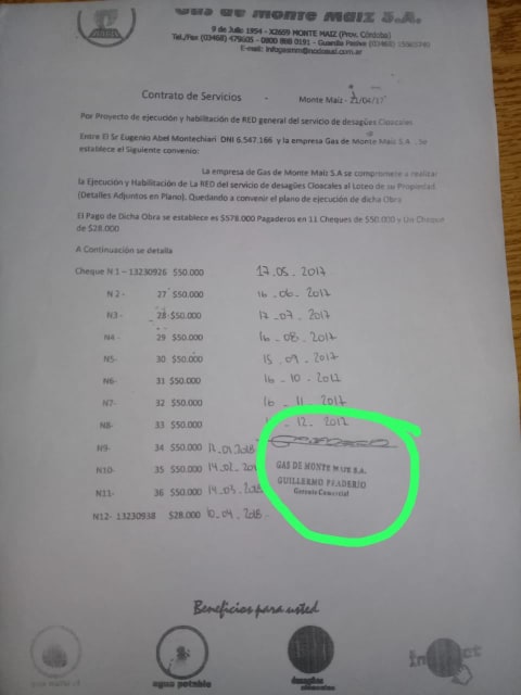 De acuerdo a lo expresado en la charla uno de los empleados dijo que “Montechiari pidió un presupuesto; se le pasa ese presupuesto, arreglaron todo en la oficina de él, con Melina Martínez, cuando terminaron de arreglar una vez que lo aceptaron vinieron a hacer el pago y se lo dejaron a él, éste es el recibo verdadero de los cheques que le hacen a Montechiari (hoja membretada de Gas donde figura el detalle de los cheques)”.
