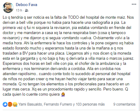 En la tarde del martes la mujer hizo pública su desconformidad con la atención en el Hospital Municipal de Monte maíz a través de su cuenta de Facebook.