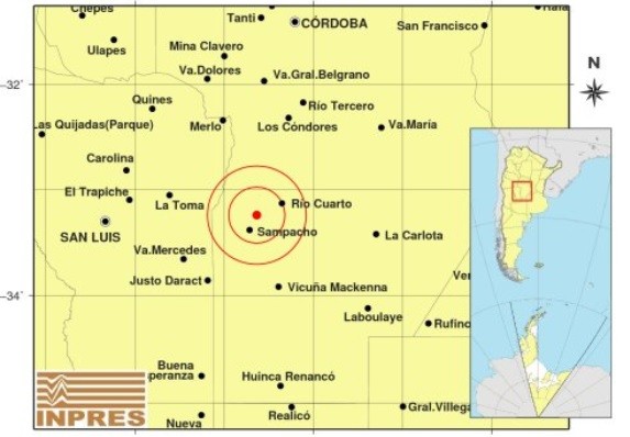 Según lo informado en los últimos minutos se trata de un sismo de magnitud 3.3 grados en la la escala de Richter cuyo epicentro fue a unos 17 kms. al NE de Sampacho a una profundidad de 8 km. El mismo trajo preocupación y alteró la noche de esa región. El horario oficial fue a las 23:56:50 hs. del miércoles. Tanto en Sampacho como en Río Cuarto no se registraron daños.