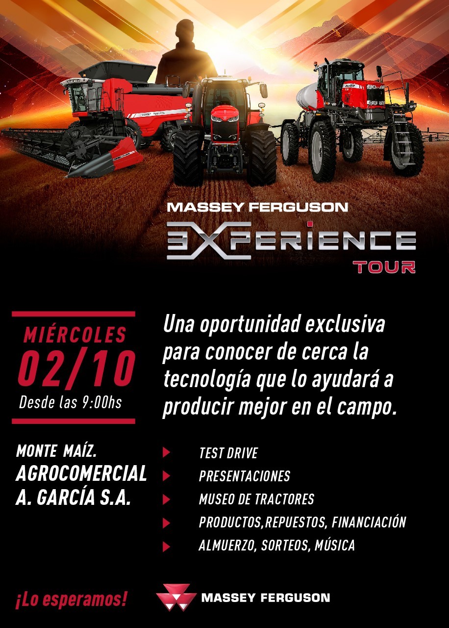 Massey Ferguson Experience Tour es una gira demostrativa a campo que la marca Massey Ferguson está organizando a nivel mundial; la misma ya se realizó en diversos puntos de Europa (Italia, Alemania, Francia, España, Noruega, Polonia y Dinamarca) y ahora llega a la Argentina, y la misma se desarrollará en las instalaciones de la concesionaria, en Ruta Provincial n° 11 KM 217, Monte Maíz, Cba.