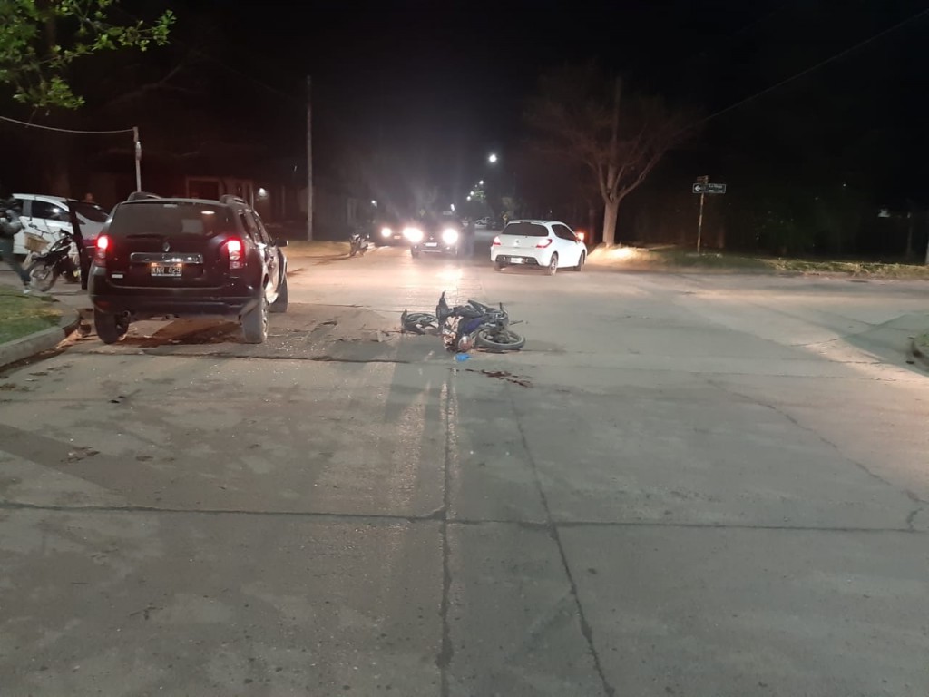 El siniestro fue protagonizado por un automóvil, Marca Renault, Modelo Duster, Dominio KNR 429 de color negro conducido por María Alejandra Monsalvo, de 46 años de edad, con domicilio en calle San Juan 1503 de nuestra localidad. La mujer circulaba por calle San Juan y al llegar a La Rioja, y doblar hacia el norte, es embestido su auto en el lateral derecho, puerta trasera, por una Motocicleta Marca Yamaha, Modelo Crypton, Dominio 653 KLS, conducida por Emerson Palmitesta de 20 años de edad, quien circulaba por calle San Juan de este a oeste y acompañado de un masculino, menor de edad (17), ambos domiciliados en Monte Maíz.
