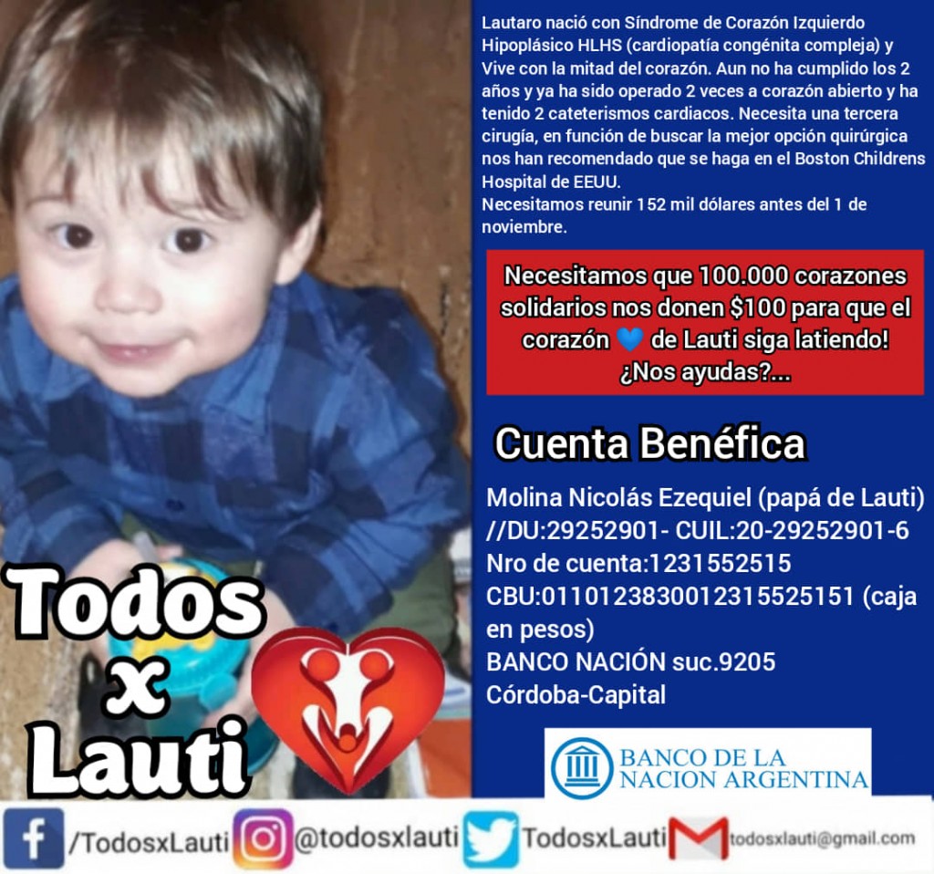 Lautaro Molina es un bebé de 1 año y 11 meses de la ciudad de Córdoba que nació con una cardiopatía congénita y necesita una intervención quirúrgica que se realizará en Estados Unidos. Por tal motivo se ha iniciado una campaña solidaria con el fin de recaudar el dinero necesario para su tratamiento. Necesita U$S152.000. Por tal motivo se ha abierto una Cuenta en el Banco Nación donde se puede hacer el aporte voluntario. La idea es conseguir 100.000 corazones solidarios que donen $100 cada uno.