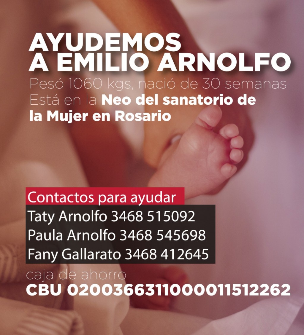 Una familia de Monte Maíz necesita juntar $20.000 para solventar gastos de alojamiento y clínicos en la ciudad de Rosario ya que a la mujer, Tatiana Arnolfo (26), debieron realizarle una cesárea de urgencia. Por tal motivo, su bebé nació en el mediodía de ayer con un peso de 1 kilo.