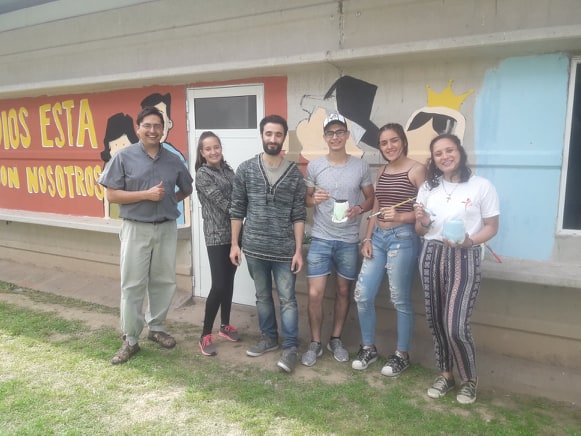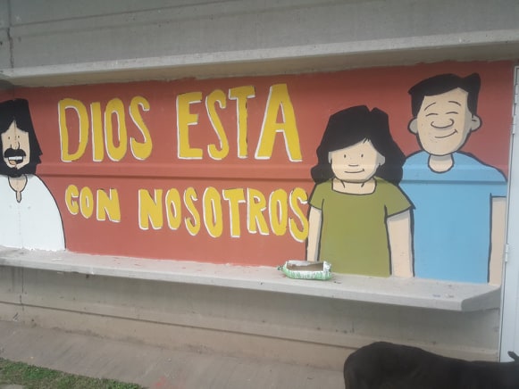 Y continuó diciendo: “Mi trabajo diario lo hago desde mi casa para editoriales y Páginas Web. Y durante los fines de semana mi misión es salir un poco a las calles y voy a donde me inviten. Hoy me tocó en Monte Maíz. Algunos de los jóvenes que están pintando hoy acá me conocieron en un encuentro en Río Cuarto y me invitaron a venir. En estas paredes de las salas de Catequesis o les hago el dibujo, de acuerdo a lo que ellos me pidan, luego preparamos los colores y ellos lo pintan. Hasta el momento pintamos una frase que dice: “Dios está nosotros”; esa la eligieron los chicos para que la gente que pase por acá la pueda leer. Y ahora hemos sumado un mural con el Cura Brochero y la Virgen de La Merced”.