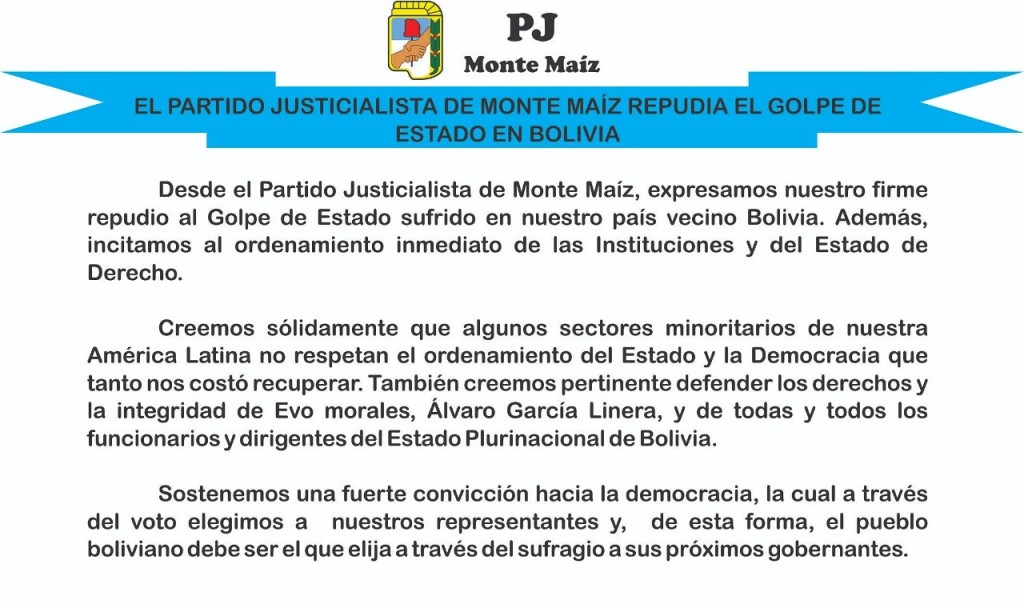 Desde el Partido Justicialista de Monte Maíz, expresamos nuestro firme repudio al Golpe de Estado sufrido en nuestro país vecino de Bolivia. Además, incitamos al ordenamiento inmediato de las Instituciones y del Estado de Derecho.