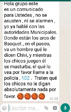 Durante el día lunes circuló un mensaje de Whats app que advierte sobre la presencia de un posible individuo que estaría haciendo demostraciones obcenas en el Paseo de la Hermandad. Más precisamente, el mensaje especifica que es en el lugar donde colocaron dos aros de básquet para que jueguen niños y jóvenes. No se sabe, a ciencia cierta, cuál es el origen del mensaje ni desde cuando hace que circula. Lo cierto es que se advierte a los padres sobre la presencia de un hombre en actitud sospechosa en ese sector del pueblo y las autoridades ya han tomado cartas en el asunto aunque no se pudo confirmar la presencia de tal personaje. El lunes por la tarde se encontraba un grupito de cuatro o cinco jóvenes jugando al básquet sin ningún tipo de inconveniente.