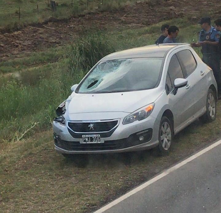 El automóvil tiene el parabrisas estallado, lugar donde impactó de lleno la víctima y en la maniobra por esquivarlo también chocó un cartel señalizador en la banquina.