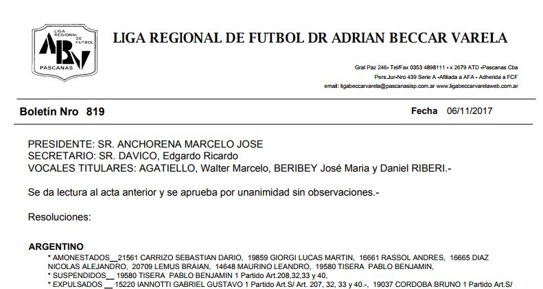 AMONESTADOS: DEPETRIS FEDERICO,  FOSCARDO ALEXIS JONATAN,  GARRIDO MARCOS SEBASTIAN,  RECHE NICOLAS,  SAPPEI CESAR DOMINGO.
