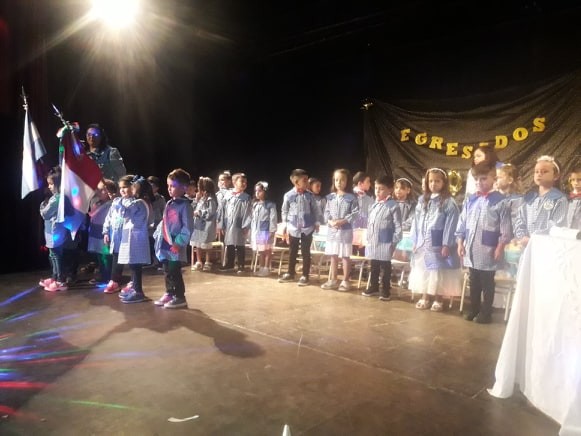 Luego de la recepción de los egresados, se recibió a la Bandera de ceremonias para hacer el traspaso de los atributos a los nuevos abanderados. Se entonaron las estrofas del Himno Nacional Argentino y dio comienzo luego el agasajo a los alumnos de la salita de 5 años.