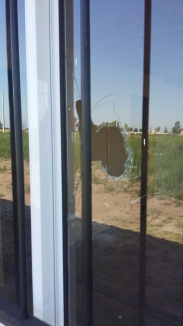 La oficina aún no está terminada aunque ya se encuentran colocadas las aberturas. En la mañana del viernes, al llegar al lugar se encontraron con un vidrio roto, aparentemente por el disparo de un rifle de aire a comprimido.