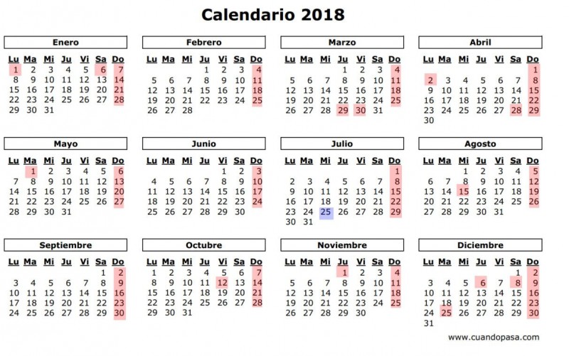 FINES DE SEMANA LARGOS PARA EL 2018 (resaltados, los puentes)