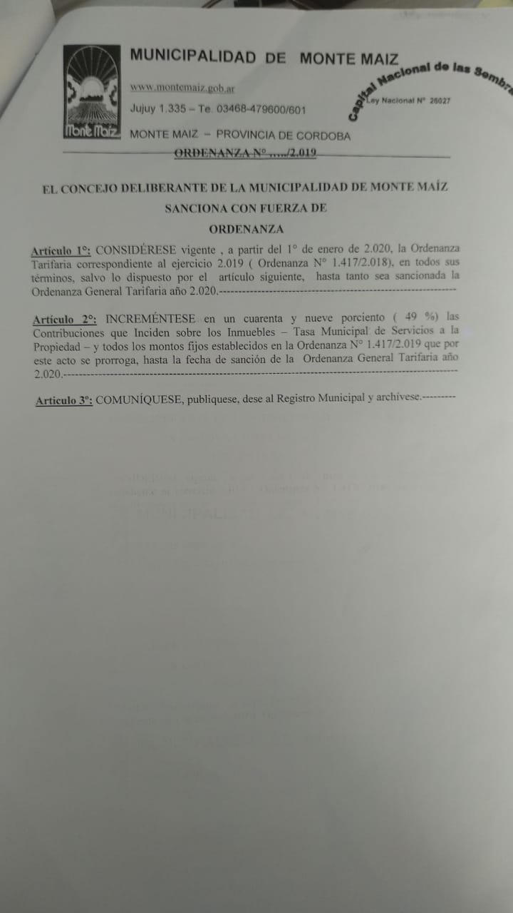 En Sesión extraordinaria del Honorable Concejo Deliberante de Monte Maíz del lunes por la noche se aprobó el Proyecto de Ordenanza que impulsa un aumento del 49% en los impuestos y tasas Municipales.