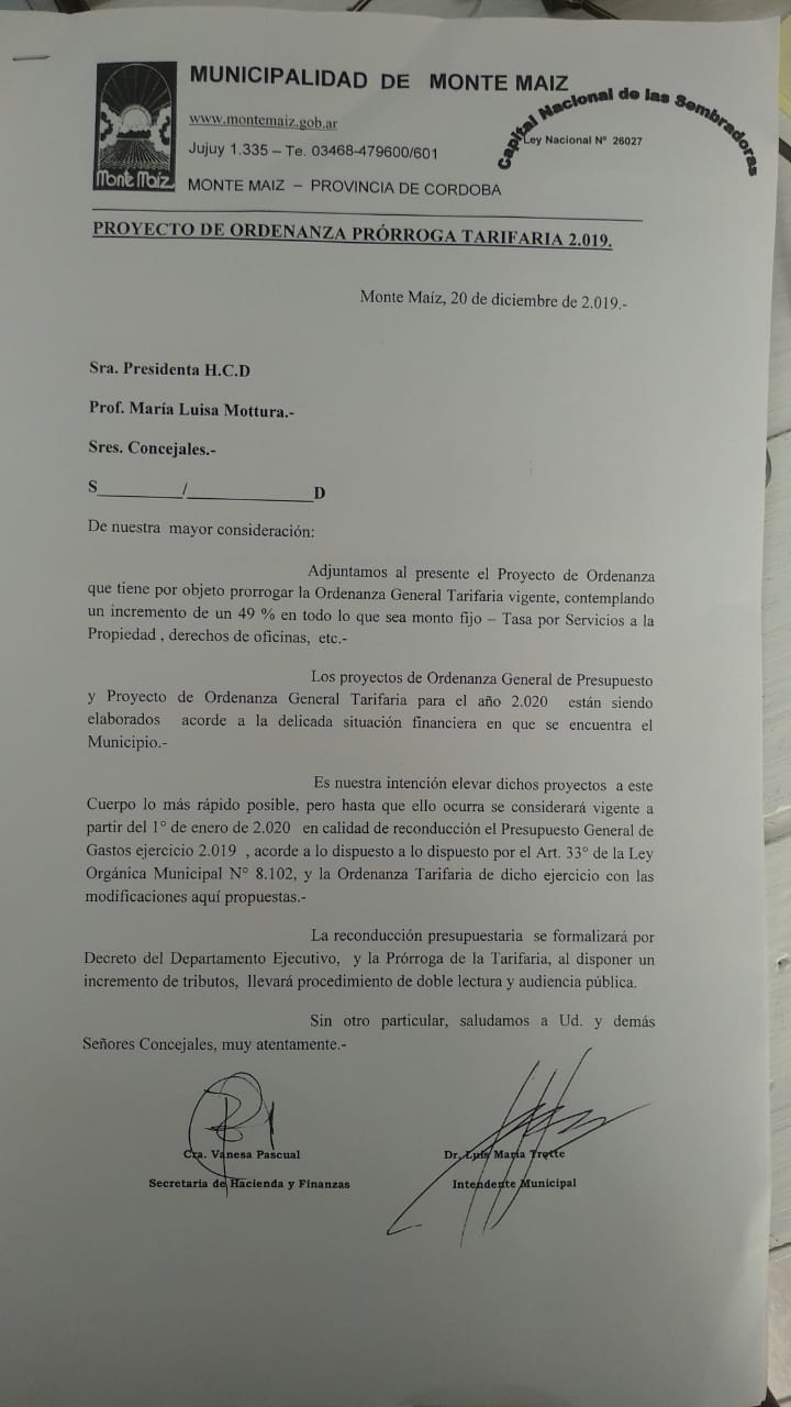 Tal Proyecto había sido enviado por el Ejecutivo Municipal y fue aprobado por mayoría ya que la Oposición –Primero Monte Maíz y la UCR- no estuvieron presentes en el Recinto.