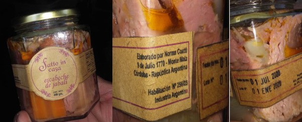 - Escabeche de jabalí, marca Fatto in casa, cont. neto 400 gr, vto 01 jul 2020. Elaborado por Norma Coatti. Nª de habilitación (municipal) 256/05.