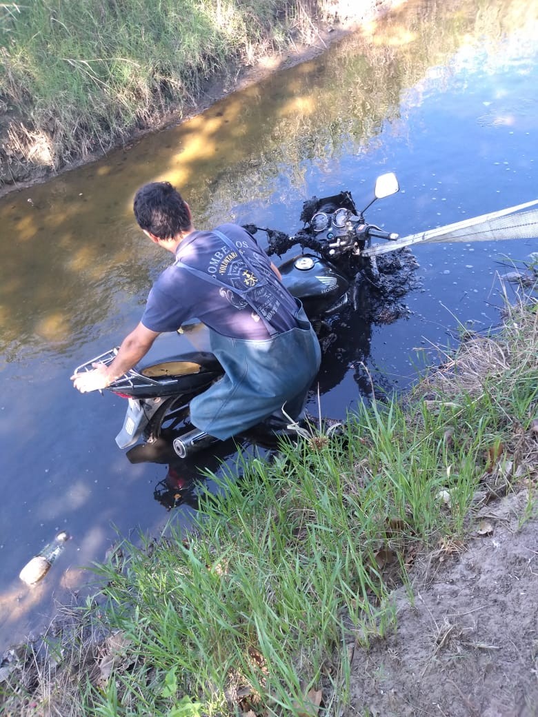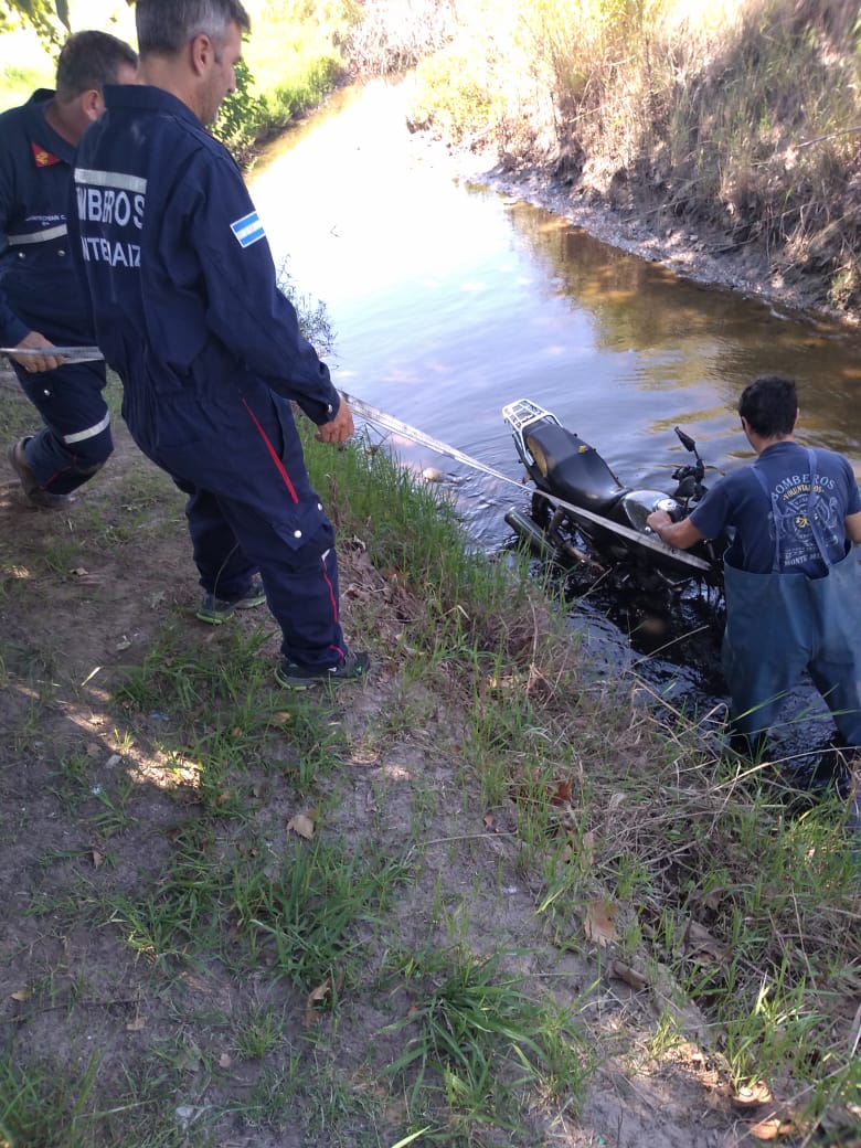 En la mañana del domingo, 11:30 hs. aproximadamente, Personal de Bomberos Voluntarios de Monte Maíz fueron convocados por la Policía local al camino al cementerio para tratar de rescatar una motocicleta que se encontraba sumergida en una cuneta que conecta con un reservorio de agua del canal maestro.