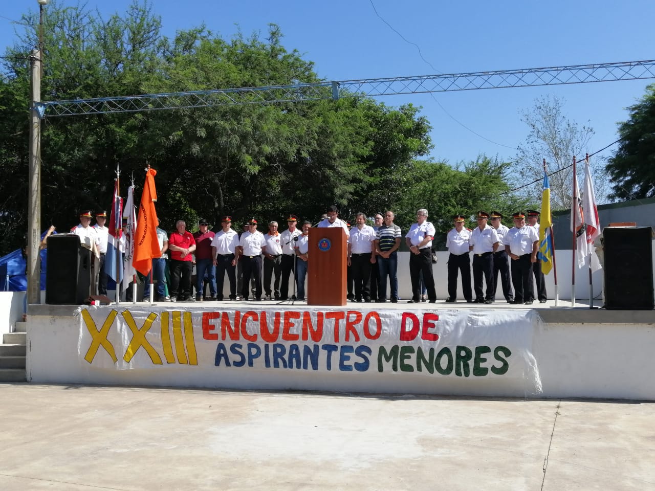 A las 10 de la mañana, del día sábado, se dio inicio formal a este 23° Encuentro, con el Acto Protocolar encabezado por el Presidente de la Federación Dr. Ariel Vicario, junto al Director del CCP Crio. Gral. B.V. Marcelo Iglesias, acompañados por miembros de sus Mesas Ejecutivas, Delegados, Coordinadores, Encargados de Departamentos, el Intendente de Las Varillas y autoridades de la Institución Bomberil.