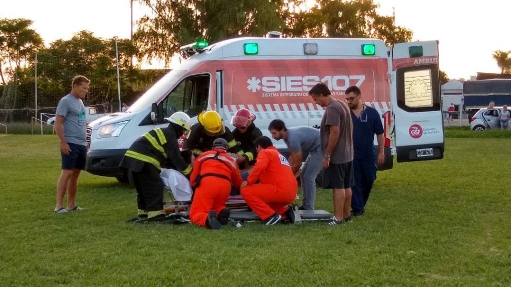 11) 19:13 Hs. El helicóptero aterriza en el lugar asignado (33°19’02.2″S 62°02’02.6″W) y comienza la recepción del paciente.