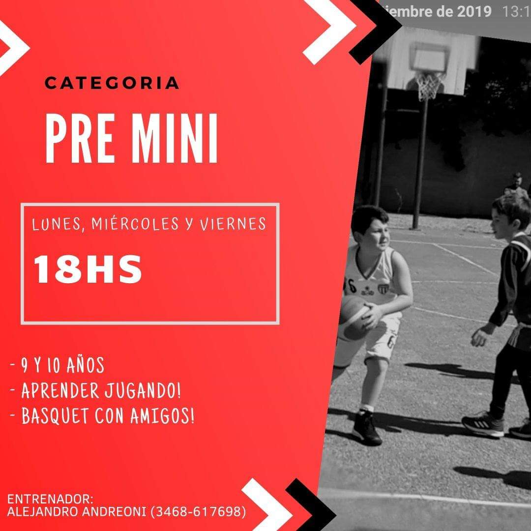 - Cat. PreMini (9 u 10 años) Lunes, Miércoles y Viernes a las 18 hs.